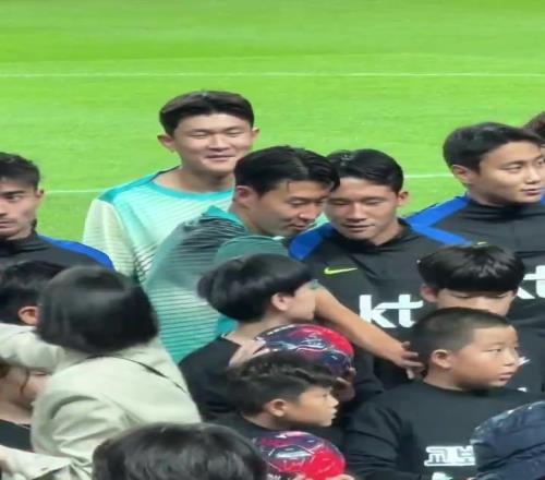 可爱对阵巴拉圭合影环节,孙兴慜与SONNY发型的小球迷打招呼